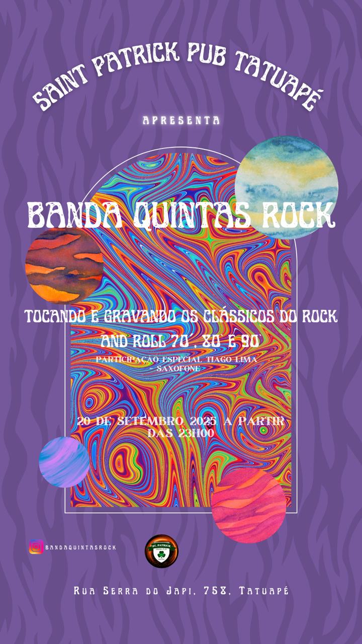 Até o ano de 2.025, vários amigos e familiares passaram pelo Quintas Rock, sendo que em março de 2.025 a banda fez seu primeiro show no St Paul´s Pub da Vila Madalena, casa do nosso querido amigo e um "marchand" das artes, Ozzy Albuquerque. Daí para frente a banda não parou mais de tocar e de se envolver em projetos musicais (alguns insanos), sempre procurando trazer a essência, energia e a vibe do classic rock dos anos 70 a 90, período de maior efervescência musical e de muita colaboração entre os vários artistas do rock, pop, blues, soul, MPB, Bossa Nova e jazz. Um dos valores que a Banda Quintas Rock procura edificar e preservar é justamente a solidariedade entre músicos, bandas, artistas consagrados ou não, que acredita ser a força motriz da evolução da arte, especialmente da música, onde sempre trabalhamos em conjunto, mas muitas vezes com interesses diversos e gostos distintos.
